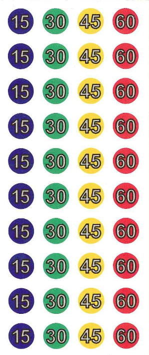 40 numeral labels/sheets of blue, green, yellow and red – 10 of each color with corresponding numerals for each Time Log model.